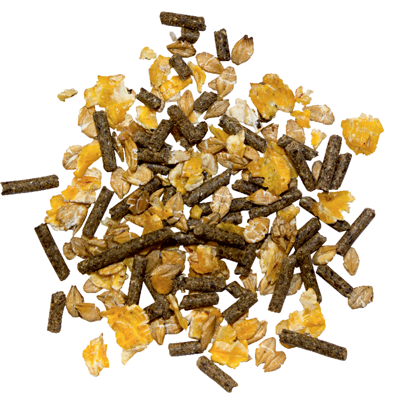 Jednotlivé zložky (v %): jačmenné vločky (30%), kukuričné vločky (20%), pšeničné otruby (18%), sušené jablčné výlisky (9,5%), melasové repné rezky - pelety (8,5%), slnečnicové škrupiny (7,5%), repná melasa (3,5%), uhličitan vápenatý (1%), chlorid sodný (0,4%), monofosforečnan vápenatý (0,25%), #.
